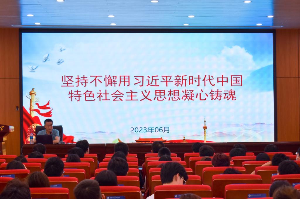 为深入学习贯彻习近平新时代中国特色社会主义思想,根据学校主题教育相关工作部署,6月12日,澳门网投唯一官网党委书记宋西路在J15-136会议室,讲授题为“坚持不懈用习近平新时代中国特色社会主义思想凝心铸魂”的专题党课。学院毕业生党员代表、联系党支部全体党员及联系班级全体学生参加党课学习。