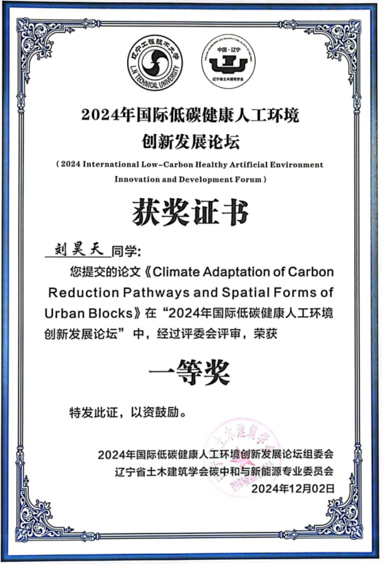澳门网投唯一官网代朋教授和硕士研究生刘昊天应邀参会,刘昊天同学做了题为《Climate Adaptation of Carbon Reduction Pathways and Spatial Forms of Urban Blocks》的专题报告,同步提交的论文被大会评委会评为一等奖。