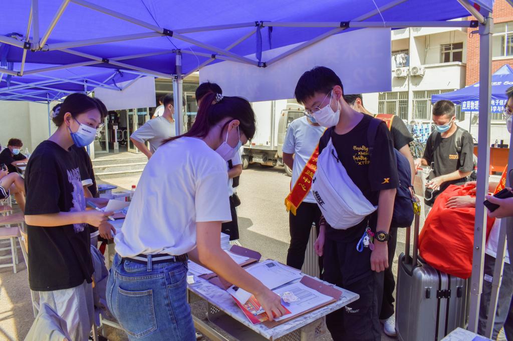 亮码、测温、出示相关证件,新生随后搭乘摆渡车去往报道点。热情的学长学姐等不及摆渡车停稳就招呼着,询问专业和班级、帮忙搬行李、带领前往迎新岗,审核完证件就可以领钥匙进宿舍啦!澳门网投出动百余名志愿者服务于南门、北门、尤洛卡广场以及宿舍楼等多个站点,为新生及时提供咨询问路、行李搬运等贴心服务。