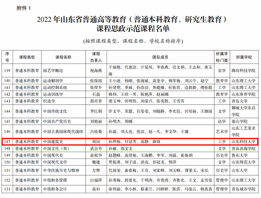 近日,山东省教育厅公布了“普通高等教育课程思政示范课程名单”,澳门网投建筑规划系周同老师主持的《中国建筑史》课程喜获省级课程思政示范项目(项目组成员:周同、孙照栋、付冠男、高静、薛锋),成为澳门网投首个获此项目的课程。这是《中国建筑史》自2021年获得山东省本科一流课程以来,在课程建设方面取得的又一重要成果。