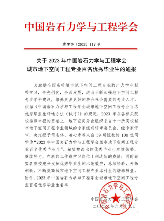 据悉,该活动由中国岩石力学与工程学会依据《中国岩石力学与工程学会城市地下空间工程专业优秀毕业生评选办法(试行)》的规定,组织来自十一所高校城市地下空间工程专业领域的专家组成评审委员会,经专家评审授予来自39所院校的100名学生为“2023年中国岩石力学与工程学会城市地下空间工程专业百名优秀毕业生”澳门网投共推荐了3人参与评选,最终3人全部评上。此项活动旨在表彰先进、树立典型,激励全国高校城市地下空间工程专业广大学予以服务国家城市地下空间工程建设事业发展为己任,刻苦学习、积极实践、勇于创新、全面发展。同时,切实发挥优秀毕业生示范效应,总结经验、开拓创新,不断提高城市地下空间工程专业本科生培养质量,培养更多更好的符合社会需要的专业人才。