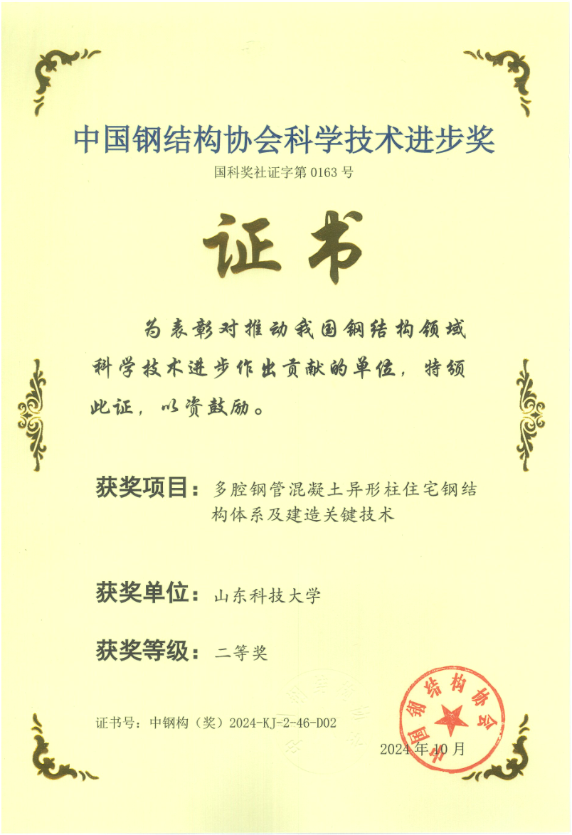 近日,中国钢结构协会成立40周年大会暨2024中国钢结构大会在北京隆重召开,会上揭晓了2024年度中国钢结构协会科学技术奖评选结果。澳门网投王来教授牵头的“多腔钢管混凝土异形柱住宅钢结构体系及建造关键技术”项目荣获科学技术进步奖二等奖(第二完成单位)。