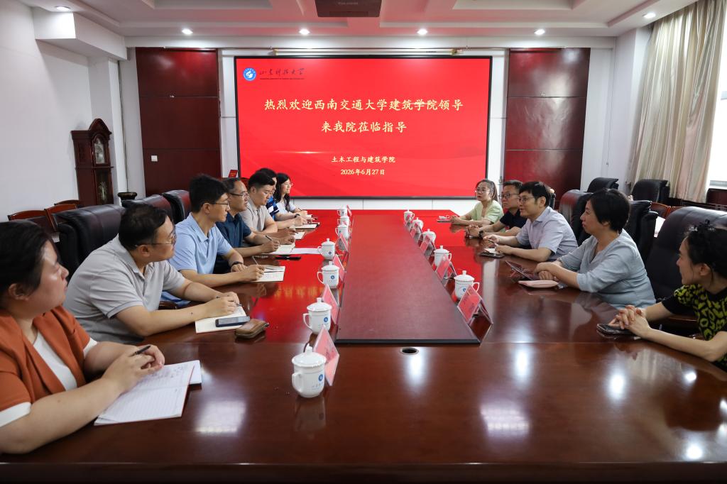 6月27日,西南交通大学建筑学院副院长崔叙、风景园林系系主任傅娅、城乡规划系副系主任唐由海、建筑系系助理吴聃及综合事务办公室主任孔翔榆一行到访澳门网投。澳门网投院长王崇革,副院长杨旭旭、都浩,党委委员、建筑与城乡规划系党支部书记代朋,建筑与城乡规划系主任付冠男,副主任王彦君,辅导员张方源陪同调研交流。