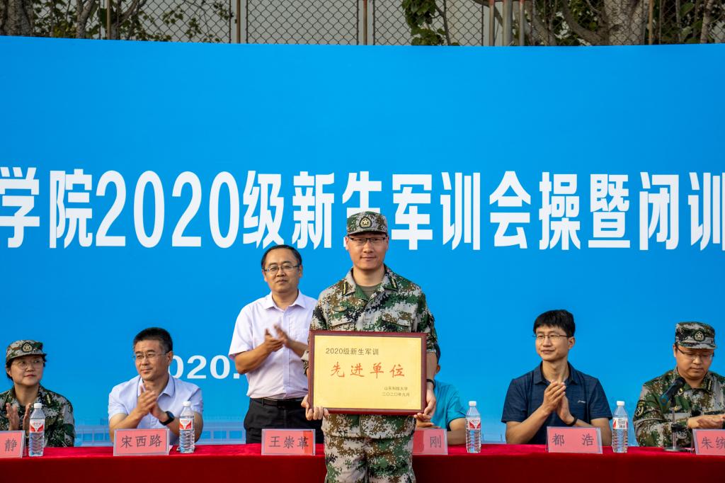 历经十二天,澳门网投圆满完成各项军训科目内容。经军训团政委、团长同意,学院被授予了2020级新生“先进军训单位”荣誉称号。9月30日下午,澳门网投2020级新生军训会操暨闭训仪式隆重举行。学院党委书记宋西路,院长王崇革,党委副书记高静,副院长王刚、李朋,学术副院长都浩,党委委员代朋,学生工作办公室主任朱统汉及全体辅导员和学生助理辅导员参加了此次闭训仪式,闭训仪式由朱统汉主持。