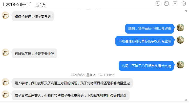8月份,澳门网投学生工作办公室各辅导员通过线上家长会、家长群、电话家访、微信一对一沟通等方式,根据学生具体情况和所处年级和时期,沟通了解学生在家期间的学习生活情况和生活动态,反馈学生在校期间表现,询问家长对学生的培养理念和期望,并给予建议。辅导员鲍娜娜在城乡规划和建筑学专业线上家长会上,向家长们介绍了2015级毕业班的就业与考研情况,并针对考研录取率背后折射出的原因和问题提醒家长们要根据学生实际学习状况规划合理目标、做出最佳选择。