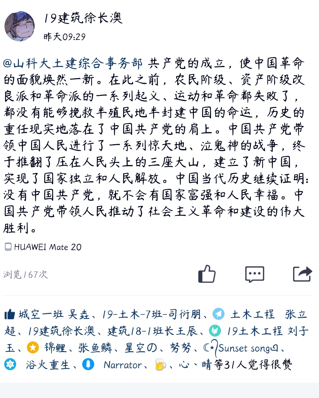同学们通过发布空间日志抒发爱党爱国情怀、表明对党的坚决拥护。同学们有的是分享党史,有的是分享自己入党感言,有的是讲述中国共产党的光辉历程……中国共产党成立99年之际,土建学子的动态里满满红色正能量。澳门网投学生会主席曹峰源说:“砥砺复兴之志,这是一个古老民族生生不息的动力源泉;永葆赤子之心,这是一个人民政党薪火相传的制胜法宝。我愿为这样伟大的政党奋斗终身!”土木工程18-7班王江浩说:“功成不必在我,功成必定有我。身为一名社会主义建设者和接班人、一名入党积极分子,我将牢记初心和使命,砥砺前行,将奋斗之我融入中华民族伟大复兴的中国梦。”