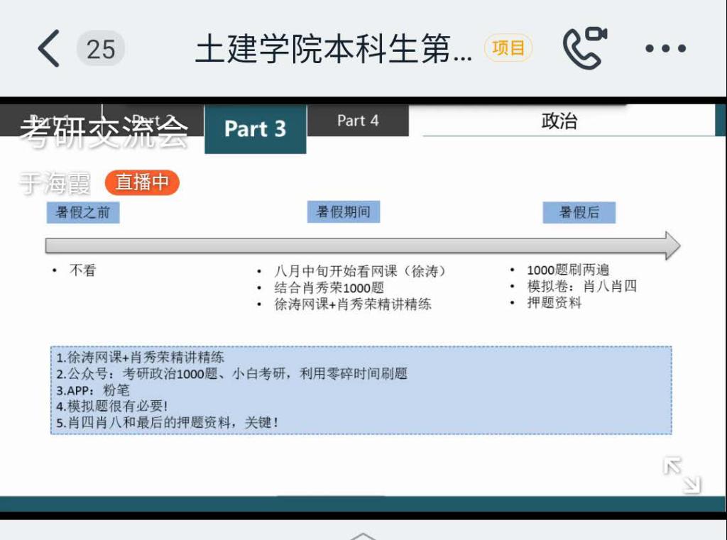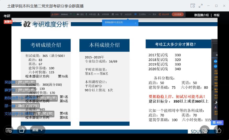 周晓璐,建筑学2015-2班,已被哈尔滨工业大学建筑学院录取,在交流会中介绍了哈工大老八校的实力水平,考研难度、考研参考书及考研计划安排。城乡规划2015级于海霞,成功考入大连理工大学建筑与艺术学院,她重点介绍了在备考过程中四门考试科目的时间安排与具体做法。敬玲玉、王映雪从快题专业课方面给大家分享了自己的经验。王储、贾儒轩分享了跨专业报考和调剂等相关注意事项。