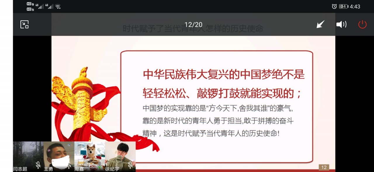 下午四时,微团课正式开始。首先,主讲人周嘉以一段有关一位大学生在疫情下的遭遇以及疫情发展的过程的视频为例,从我国体制机制、党的正确决策、全民战疫等方面,分析我国为何能取得疫情防控的阶段性胜利。随后,他又立足于青年一代,分析了时代赋予当代青年人怎样的历史使命,并以抗疫中优秀青年人代表大的事例,进一步引导同学们反思青年一代应当如何为中国梦的实现贡献自己的力量。最后,主讲人赵鑫源与同学们一起讨论了面对时代大任时,新时代青年应该如何去做。他总结道:“青年人要树立信仰,为青春定向;学好知识,用知识为青春赋能;努力奋斗,用奋斗为青春添彩;争做新时代新青年,牢记使命,锻造本领”。