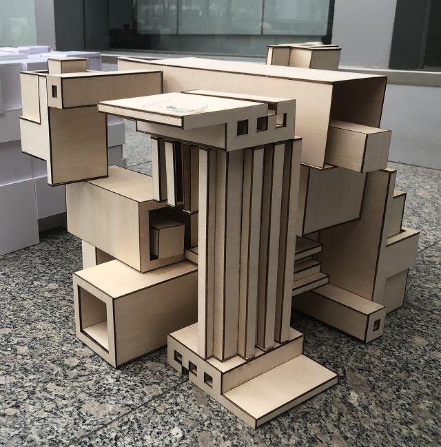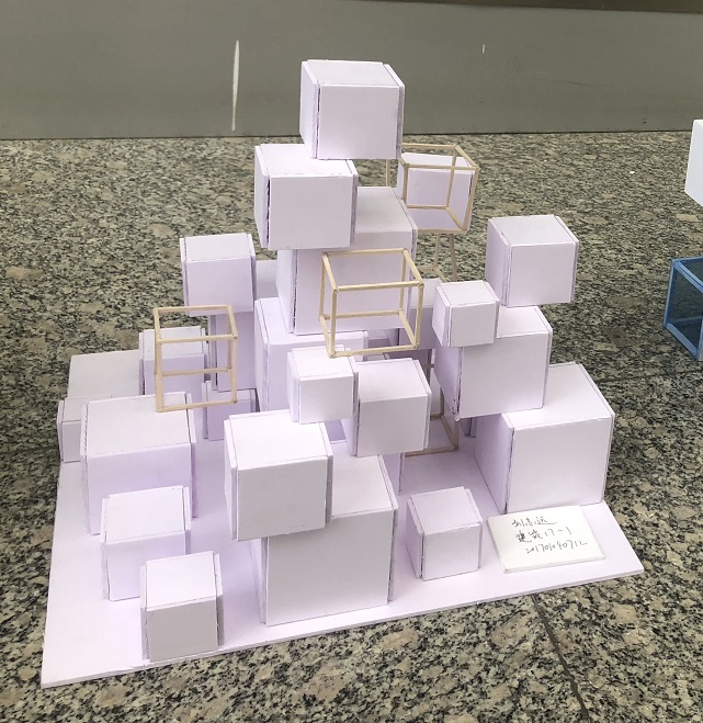 本次构成模型展览的作品包括“切割”与“堆积”两个板块。“切割”要求将具有空间限制性的体块通过分割、消减等手段,制作成富有变化的简单空间几何体;而“堆积”则要求反复利用简单几何体,通过堆叠、重复等形成具有一定趋势性的空间几何体。同学们严格按照要求,使用了各具特色的设计理念与形体概念,利用Sketch up与V-ray等软件进行设计,使用不同材料制作完成。