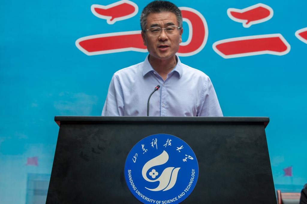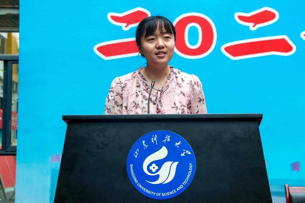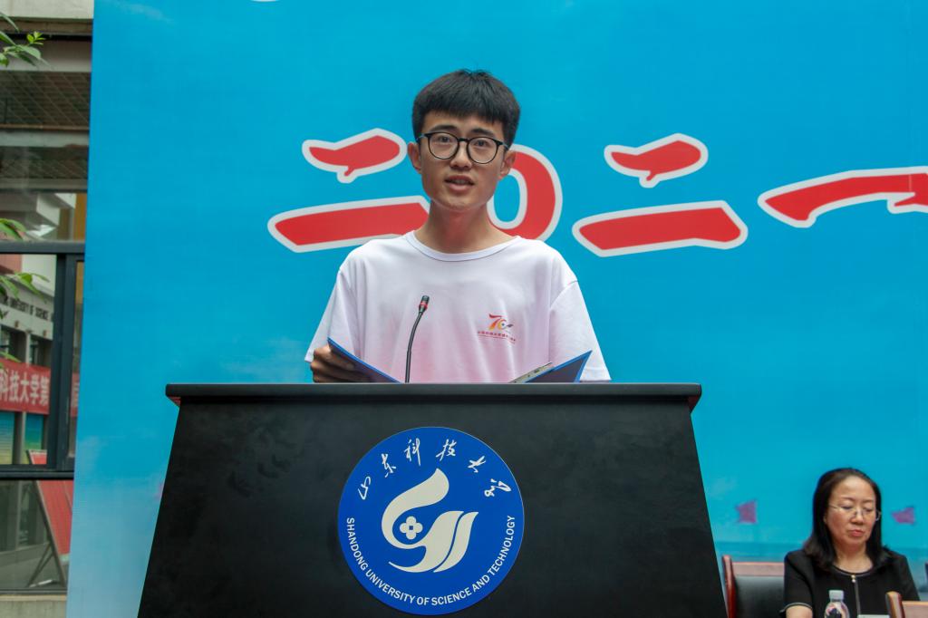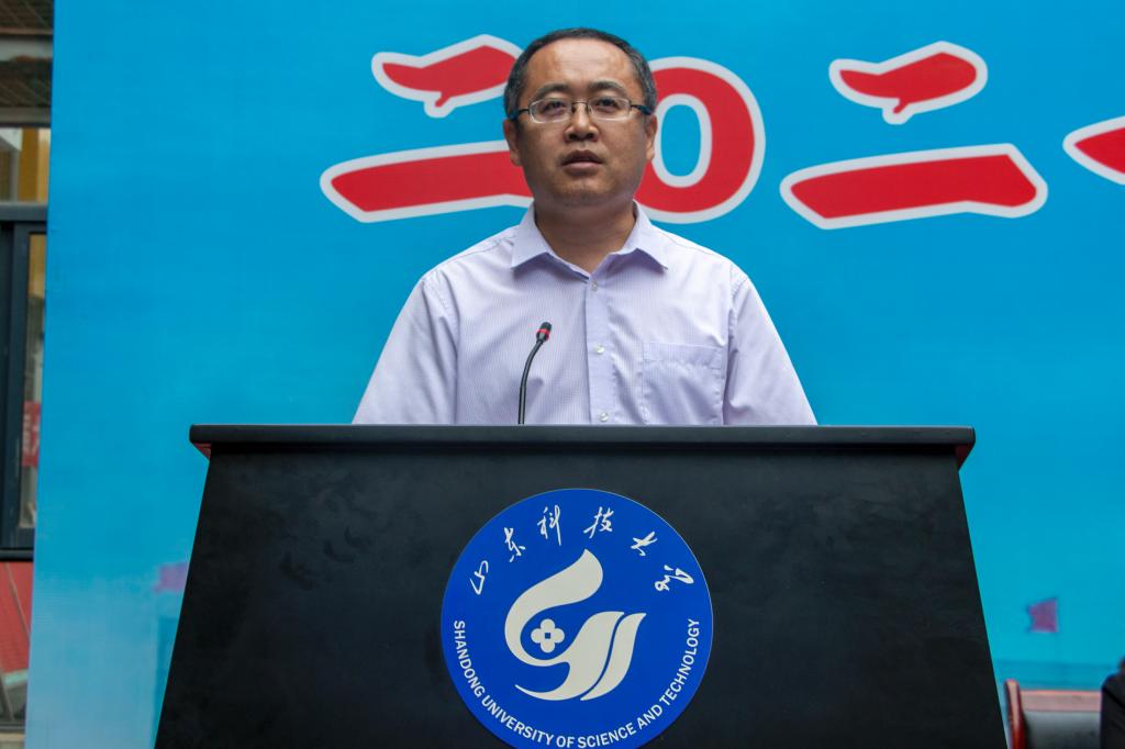 学院教师代表、青岛高校教学名师孙跃东讲话。他表示,作为老师能够陪伴同学们一起学习、生活和成长非常荣幸,看到同学们学业有成倍感欣慰,并表达了对同学们的希冀。希望同学们牢记“惟真求新”的科大校训,发扬“诚实、勤学、吃苦、耐劳”的精神,踏踏实实做人,勤勤恳恳做事,不断提高专业素养,逐步实现个人价值。