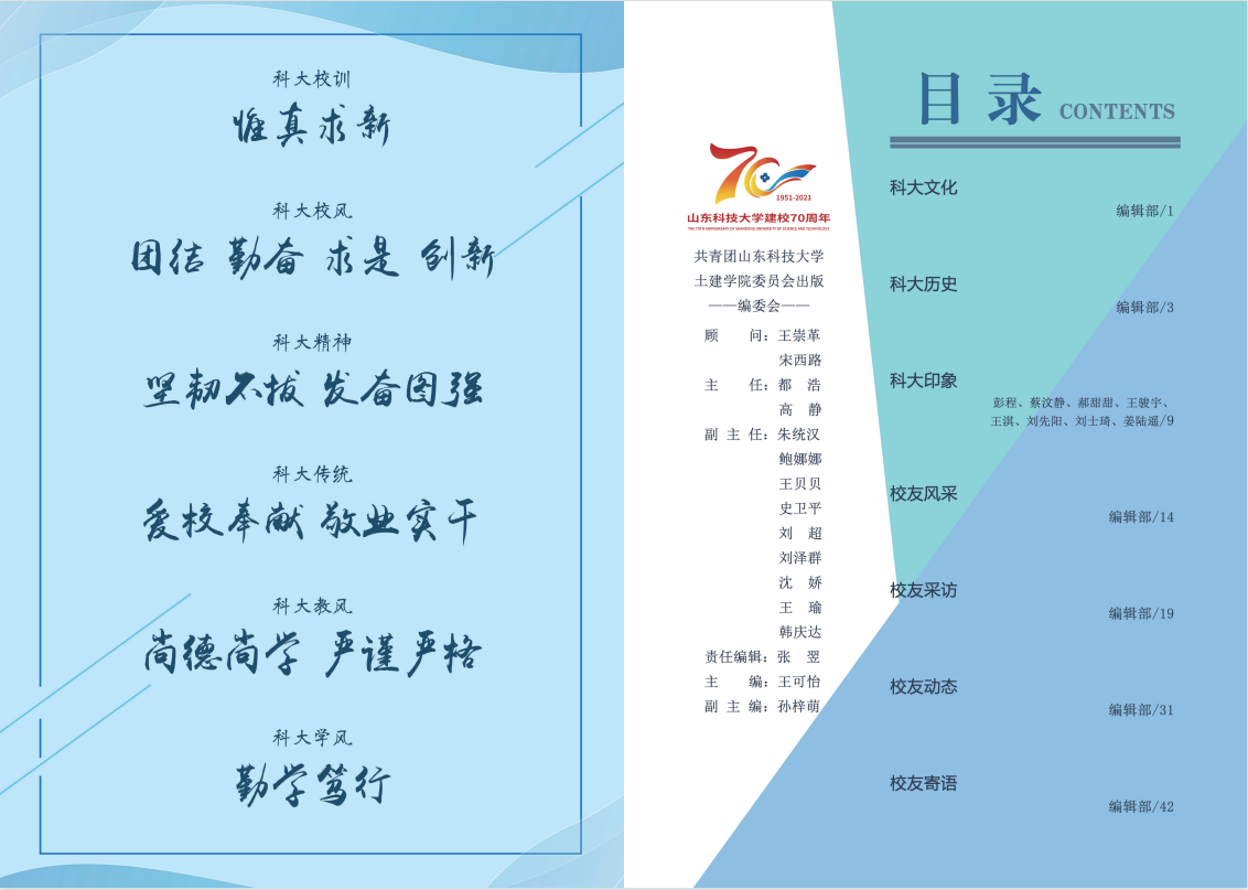 《建设者》校庆特刊由澳门网投党委指导,学院新闻宣传中心编撰,包含“科大文化”“科大历史”“科大印象”“校友风采”“校友采访”“校友动态”“校友寄语”等七个板块,从不同视角呈现了科大之底蕴、土建之传承,帮助更多校友了解科大发展脉络、土建成长历程。本次校庆专刊特邀泰安、济南、济宁等校友会,以及多位优秀校友为山科送上生日祝福,充分展示了学院校友工作的成果和对科大真诚的祝愿。