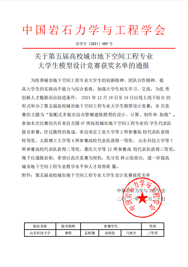 2021年12月18日至19日,第五届高校城市地下空间工程专业大学生模型设计竞赛以线上线下结合的方式成功举办。该竞赛由中国岩石力学与工程学会主办的全国性专业技能大赛。由澳门网投城空与岩土专业本科生组成的澳门网投唯一官网团队荣获全国二等奖。