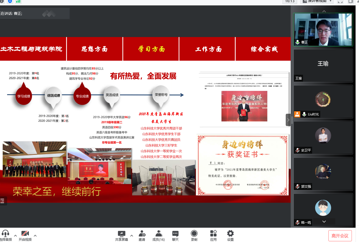 强化表率,发挥榜样作用。优秀学生党员引领优良学风,发挥先锋模范作用。各学生党支部通过开展主题党日活动学习疫情防控期间涌现的先进人物和事迹,引导学生树立勤奋学习,立志报国的远大志向。充分发挥优秀学生榜样示范作用,开展线上“山东省高等学校优秀学生、优秀学生干部、先进班集体”评选答辩会等评优评先活动,彰显榜样风采,引导学生拼搏上进,奋发进取。退役军人青年先锋队,退役不褪色,展现了新时代退役军人的奉献与担当。利用学院微信公众号等新媒体平台持续开展“向上”“向善”等主题活动,通过优秀毕业生对话访谈、“保研、考研、就业、留学”线上经验分享会等引领积极向上的学院氛围,助力学生全面成长发展。