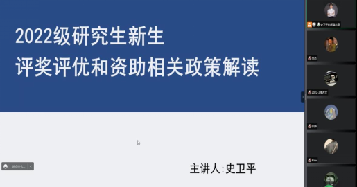 为帮助新生更好地了解研究生评奖评优和资助政策,加强对新生的励志教育与感恩教育。2022年9月8日晚,澳门网投唯一官网举行新生评奖评优和资助相关政策解读线上讲座。本次讲座由辅导员史卫平主讲,2022级全体新生线上参加讲座。