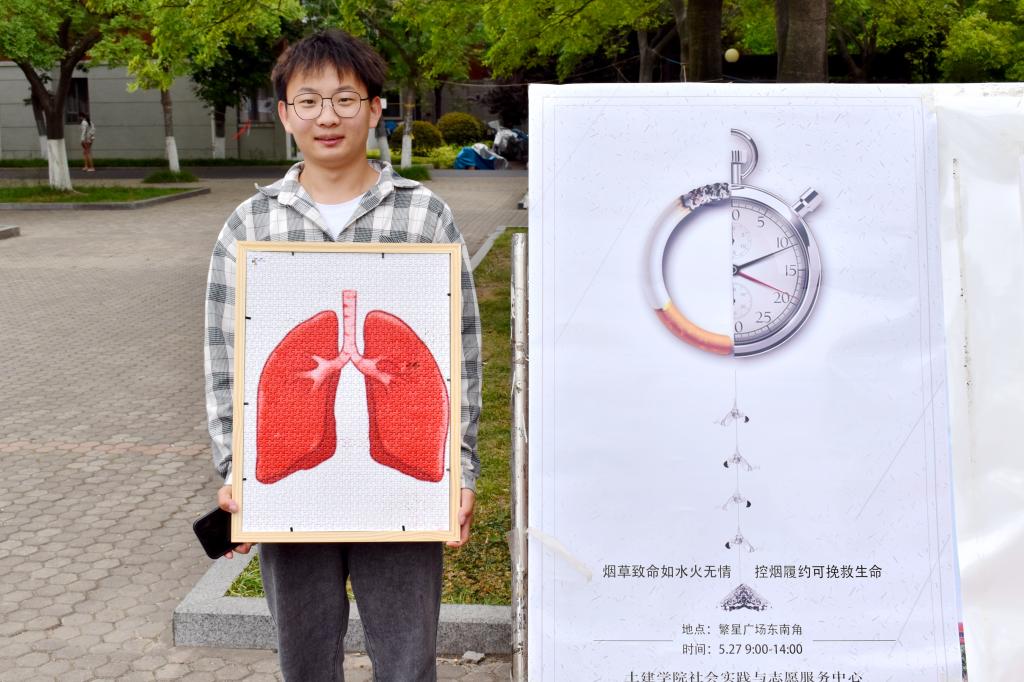 参加的学生每人领取一块拼图,在集体努力下拼成的‘健康肺’图样,寓意着为无烟校园贡献自己的一份力量。“关于烟你了解多少?”“二手烟的危害有多大?”活动现场,志愿者们发放了有关吸烟危害的宣传卡片,通过通俗易懂的语言、生动形象的图片,让广大同学了解烟草的危害、戒烟的好处以及如何帮助家人戒烟等内容。活动最后,大家陆续在海报上盖上“禁止吸烟人人有责”的印章,承诺自觉抵制吸烟行为,做自己健康的主人。