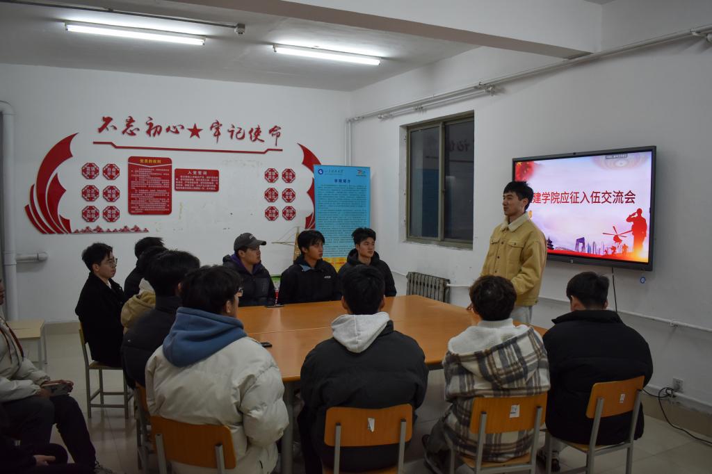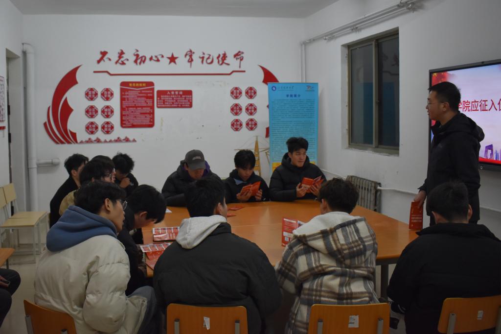 为进一步贯彻落实国家征兵政策,积极动员学院青年学子踊跃报名参军、献身国防,12月18日,澳门网投于GB2宿舍楼党员之家举行应征入伍交流会,团委辅导员老师王瑜,退伍复学学生代表尹国鹏、张泽培以及有意愿入伍的同学参加会议。