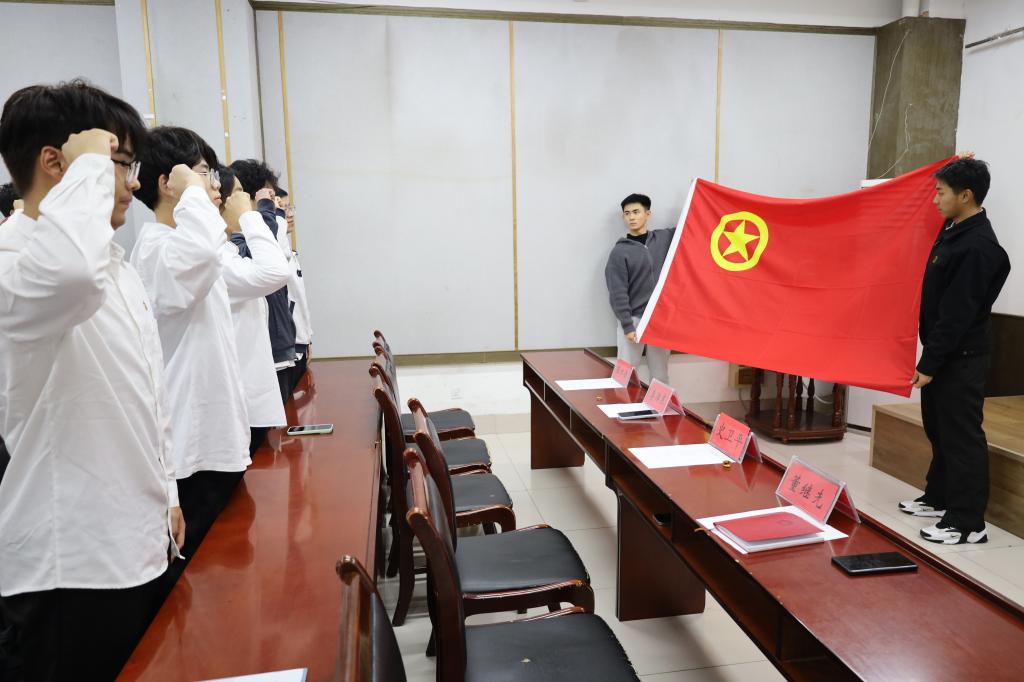 仪式在庄严的国歌声中拉开序幕。张方源宣读了新发展团员名单,随后,史卫平、董继先、李沛东为新团员代表佩戴团徽。一枚枚闪耀的团徽佩戴在胸前,象征着责任的开始,也标志着他们正式成为共青团的一员。