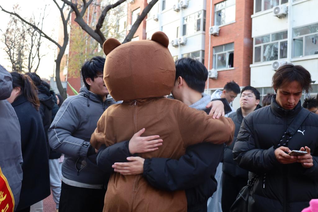 活动以轻松有趣的互动环节拉开序幕,迅速点燃现场气氛。“同学,加油!”两只憨态可掬的“轻松熊”玩偶穿梭于人群,主动张开双臂,为学子们送上一个个温暖而治愈的拥抱,瞬间抚慰了备考的紧张与疲惫。一旁的彩色“前程似锦”签名墙,则迅速成为焦点,同学们纷纷执笔,郑重签下姓名,并写下“一战成硕!”“金榜题名!”“一定上岸!”等豪迈誓言。一笔一画,汇成闪耀的信念之光;欢声笑语中,大家压力得以释放,信心随之升腾。