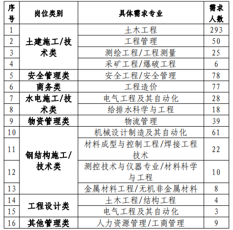 重点院校土木工程、机械设计及其自动化、安全管理、测绘工程、材料成型与控制工程、焊接工程技术等相关专业本科及以上学历毕业生择优列入计划,提供薪资待遇、双导师制、业务专项培养、重点项目锻炼平台四类保障。