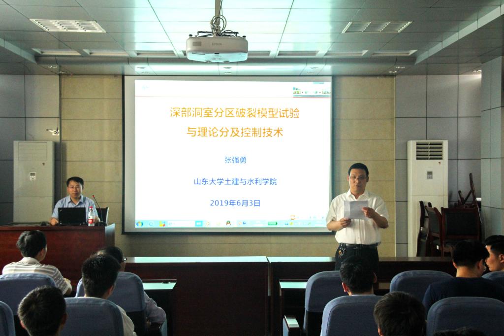 6月3日,澳门网投邀请到泰山学者特聘专家、教育部新世纪优秀人才支持计划获得者、山东大学土建与水利学院副院长张强勇于土建楼219报告厅作报告,学院副院长张宪堂主持了本期名家讲坛。报告以“深部洞室分区破裂模型试验与理论分析及控制技术”为题,从深部洞室分区破裂模型及工程应用等方面展开讲解。