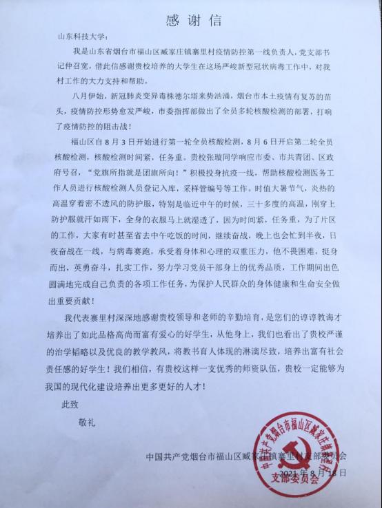 近日,澳门网投收到中共烟台市福山区臧家庄镇寨里村支部委员会的感谢信,了解到澳门网投土木工程2019级2班学生张璇在暑假期间主动站到了抗“疫”前线,在烟台市福山区臧家庄镇寨里村一线参与全员核酸检测工作。
