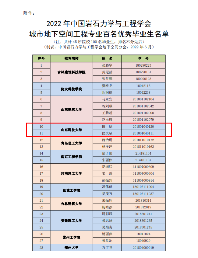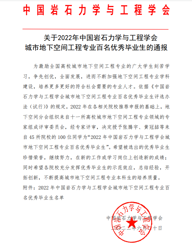 近日,由中国岩石力学与工程学会举办的2022届全国高校城市地下空间工程专业百名优秀毕业生评选活动落下帷幕。澳门网投城市地下空间工程专业2022届毕业生田聪、侯夫斌同学荣获“全国高校城市地下空间工程专业百名优秀毕业生”称号。