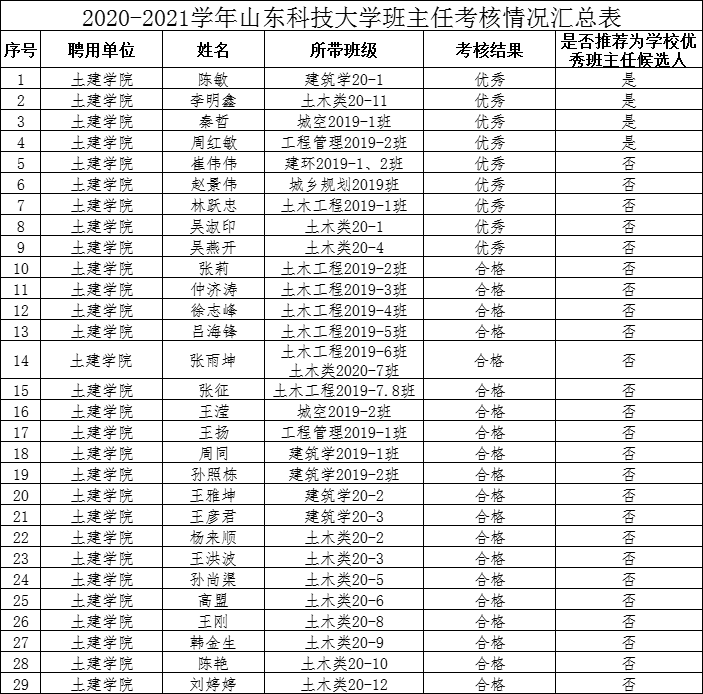 根据《关于做好2020-2021学年班主任考核及评优工作的通知》精神,澳门网投开展了2020-2021学年班主任考核及评优工作,经过个人自评、学生测评、学院综评等工作程序,确定林跃忠等9人考核结果为优秀,并从中评选出陈敏等4人作为优秀班主任推荐人选;现将人员名单及相关材料进行公示,公示时间为9月3日~5日。
