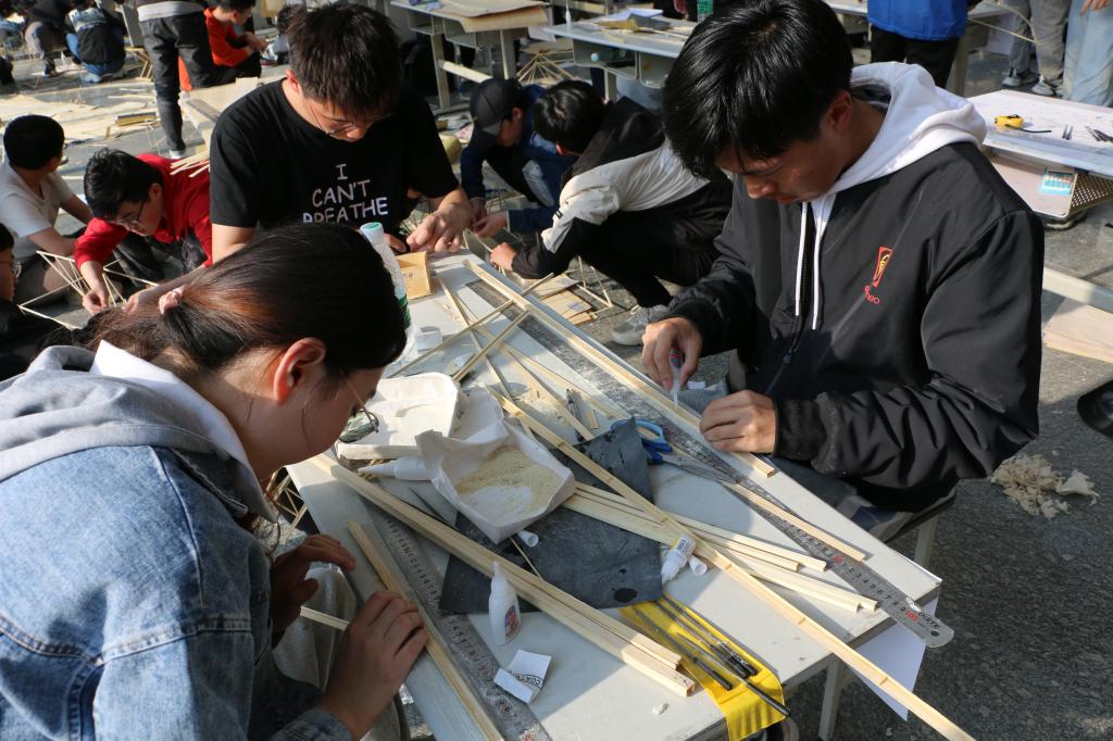 经过经验分享会、赛前赛题讲座等筹备活动,选手们对结构设计、赛品质量、加载承重等方面做好了充分准备。上午8时,比赛正式拉开帷幕,学院党委副书记高静致开幕词,她鼓励同学们多一些创新,多一些实践,希望同学们将所学知识活学活用,预祝大赛取得圆满成功。建筑工程系副教授林跃忠在辅导员鲍娜娜陪同下现场指导,对设计过程中出现的明显失误及时提醒。参赛队员配合默契,争分夺秒,精心设计。经过十个小时的制作过程,截至下午6点,共有41支队伍完成赛题制作。制作结束后,工作人员对各组模型进行现场称重。